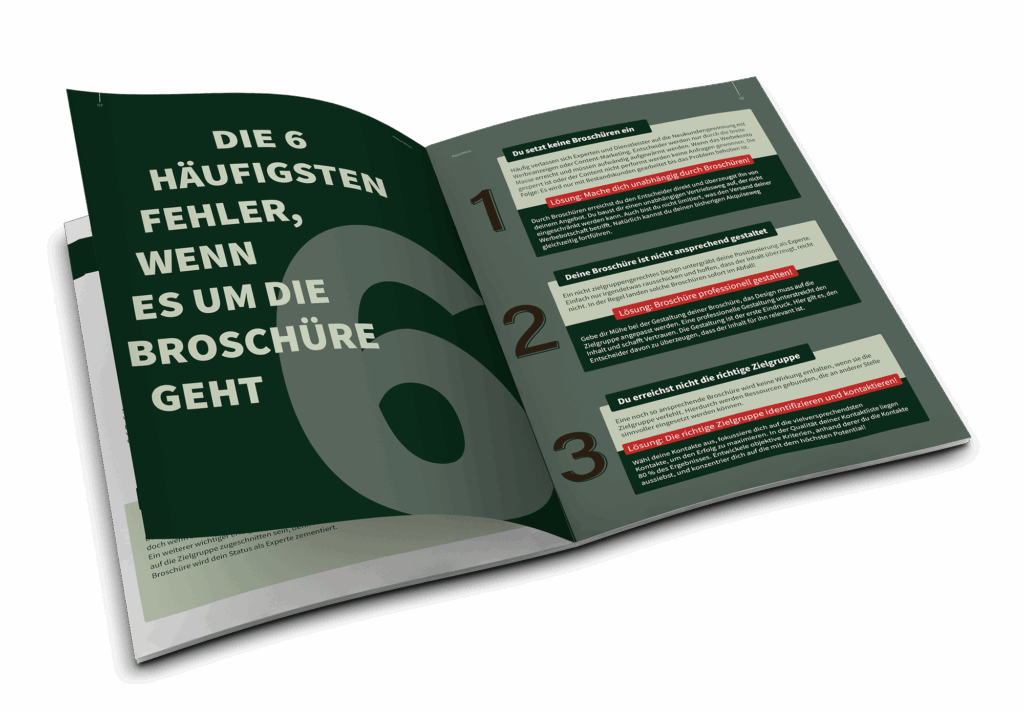 - Wie du in 4 Schritten deine eigene Broschüren-Strategie umsetzt, um Entscheider direkt zu erreichen und Vertrauen aufzubauen – ohne Ads oder Kaltakquise.
